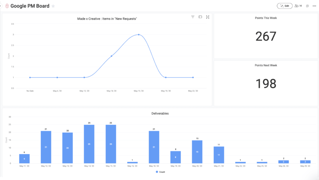 Kyle creó un sistema de puntos para estimar el esfuerzo general que se requiere para completar cada elemento de acción dentro de un proyecto. Ahora tiene ese sistema de puntos reflejado en un tablero para visualizar mejor la capacidad de los diseñadores que trabajan en sus cuentas y ofrece la misma visibilidad a otras partes de la agencia.