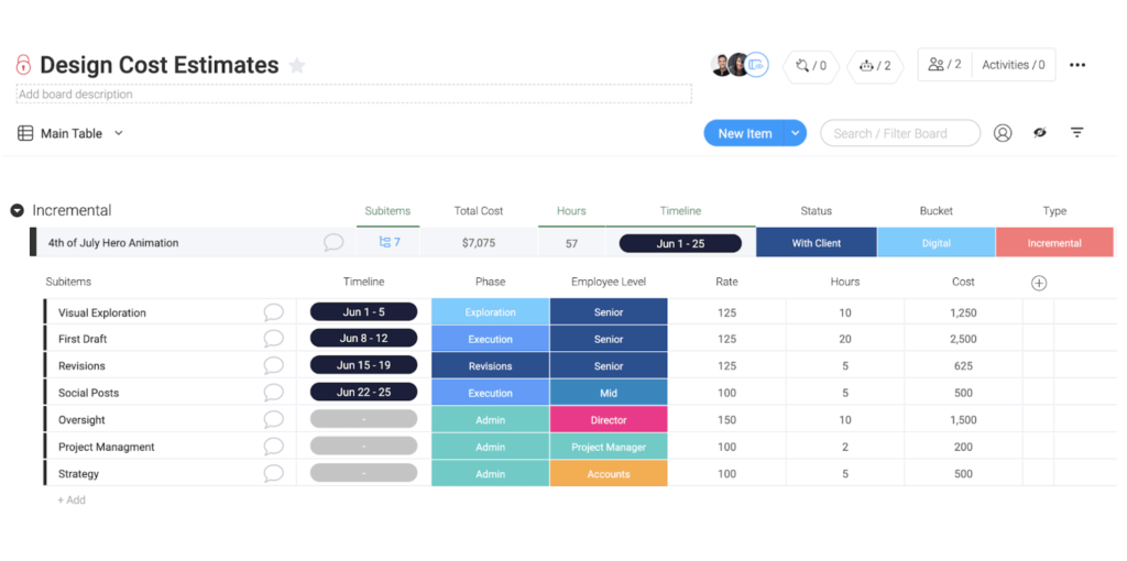 Antes de monday.com, los gerentes de proyecto “estimarían” la cantidad de tiempo que tomaría completar las diversas etapas de un proyecto y predecir el costo en consecuencia. Ahora, utilizando el seguimiento del tiempo directamente en un tablero de monday.com, pueden predecir con precisión y eficacia cuánto costará un proyecto.