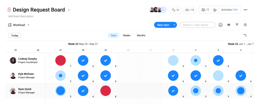 Kyle y Ryan también usan la función de carga de trabajo cuando las solicitudes llegan ad hoc y sus diseñadores están en capacidad de ver si alguno de sus equipos puede asumirlo en su lugar.